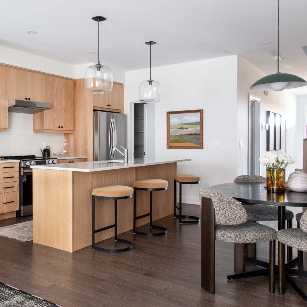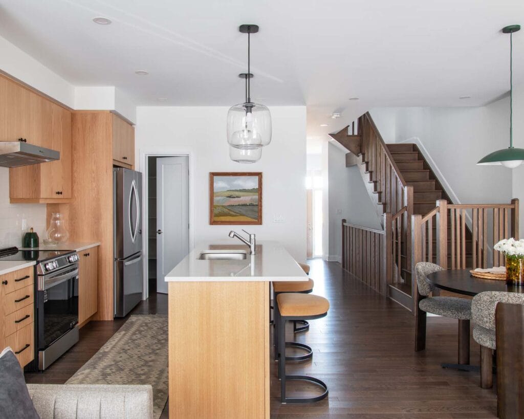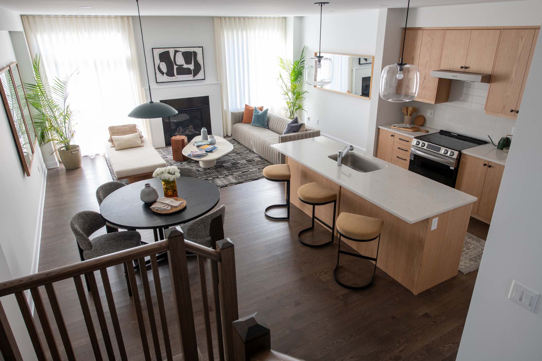 The Ferguson mid-unit Contemporary Townhome features 3 bedrooms, a loft and 2.5 bathrooms in a bright and open 2260 sq.ft. This model is equipped with a single-car garage and includes 463 sq. ft. of finished basement.